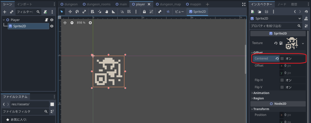 衝突判定とかはしてないのでSprite2Dノードを作成し、キャラクター画像を設定しているくらいです。