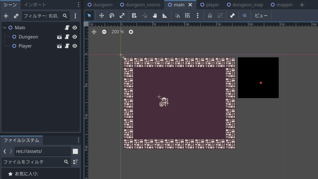 DungeonシーンとPlayerシーンを子ノードとして持っています。